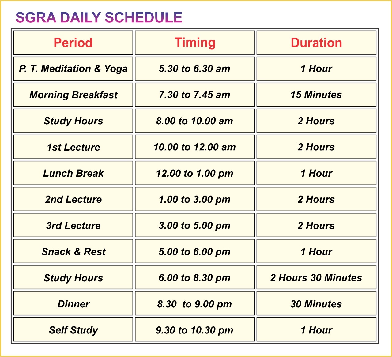 The hosteller students have been provided with a regular planned and tested schedule to help them to cope up with the rigors of the academics and other activities.The schedule is as follows: